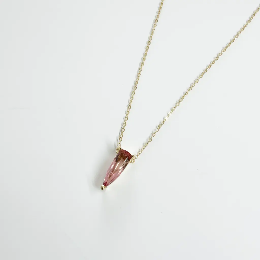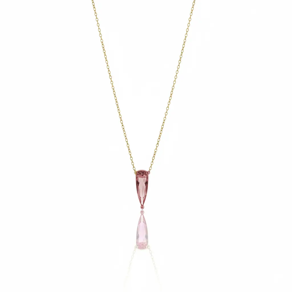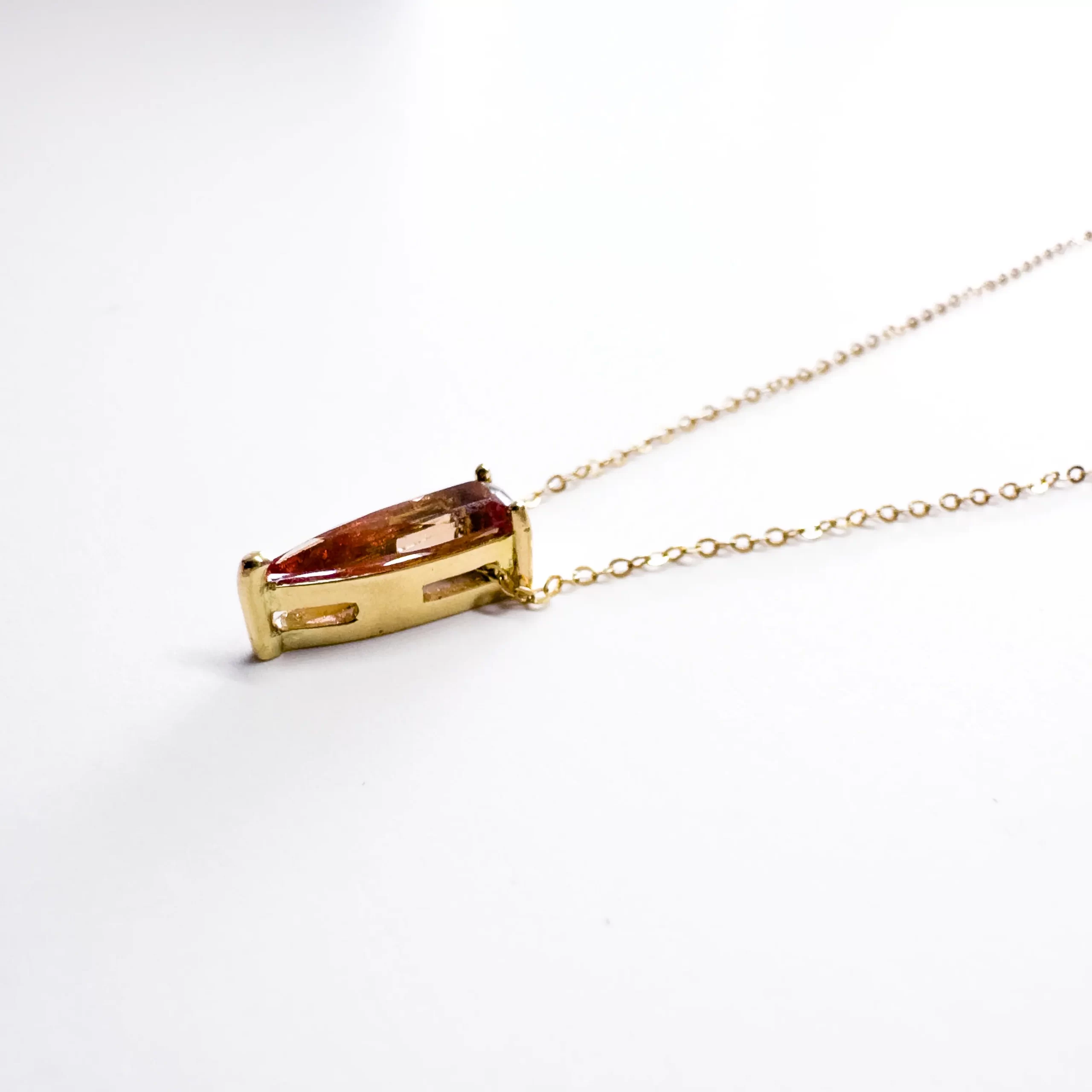 Esta piedra bicolor te permite apreciar diferentes tonos rosa melón en la misma gema, creando un efecto visual hipnotizante que cambia según la luz. Su forma de péndulo representa la conexión profunda entre la intuición, la energía universal y la sabiduría interior. Una maravillosa piedra de turmalina rosa engastada en oro amarillo de 18 quilates que combina elegancia atemporal con poder espiritual.