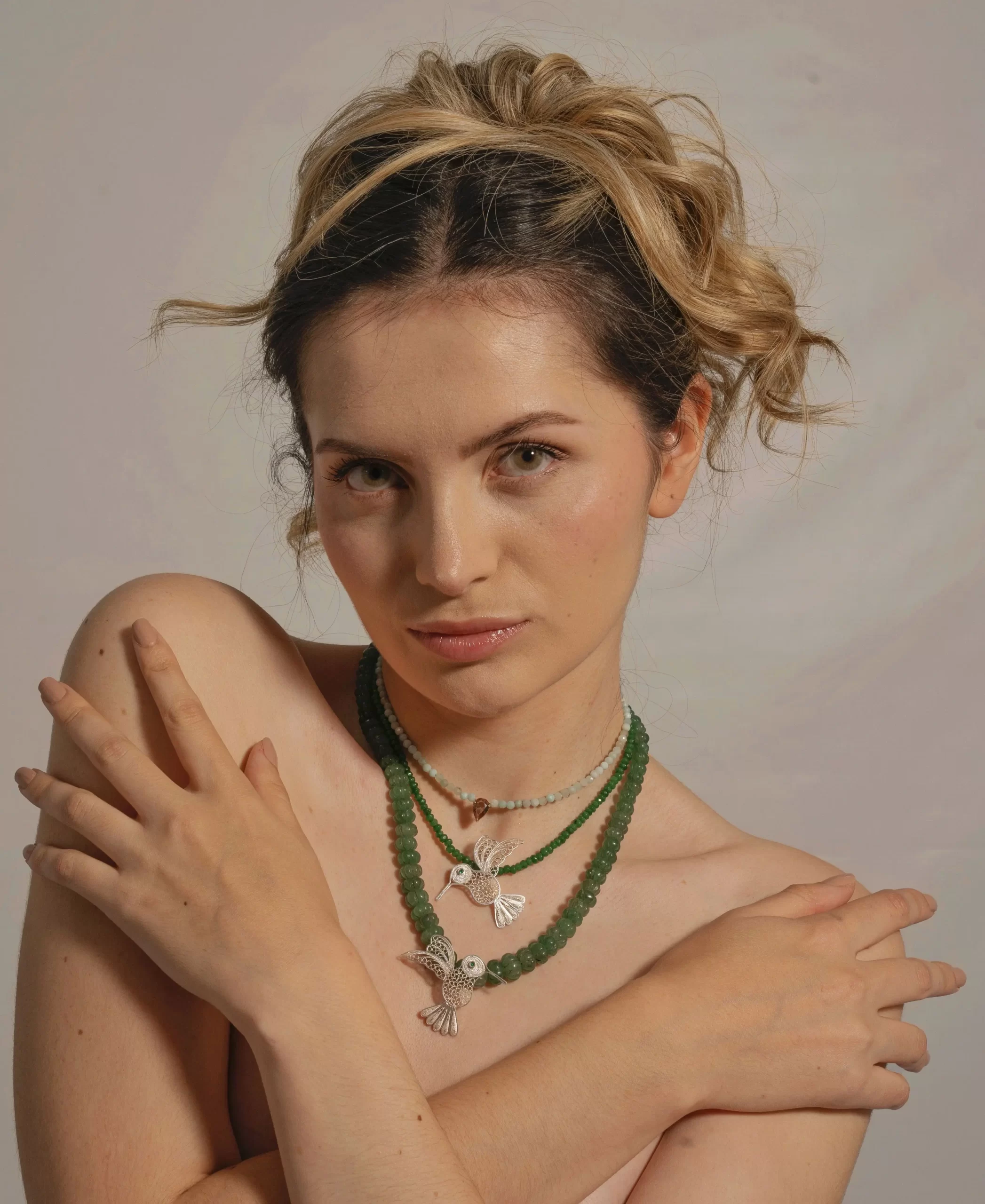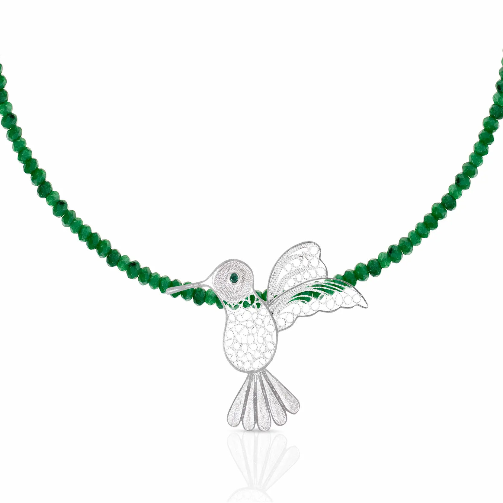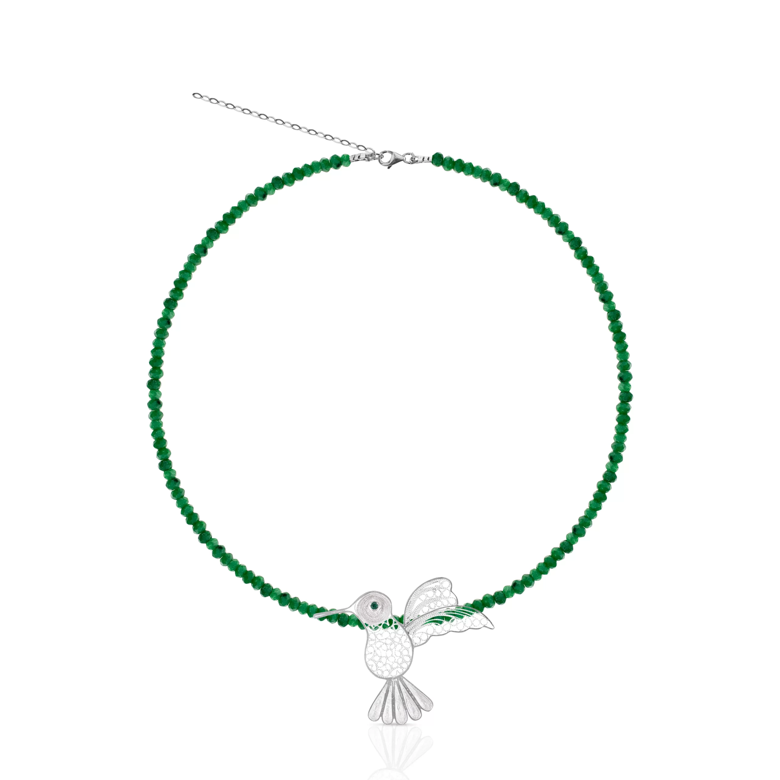 Collar de clorita elaborado con piedras naturales, en el centro tiene un dije de colibrí elaborado en filigrana mompoxina en plata ley 925.