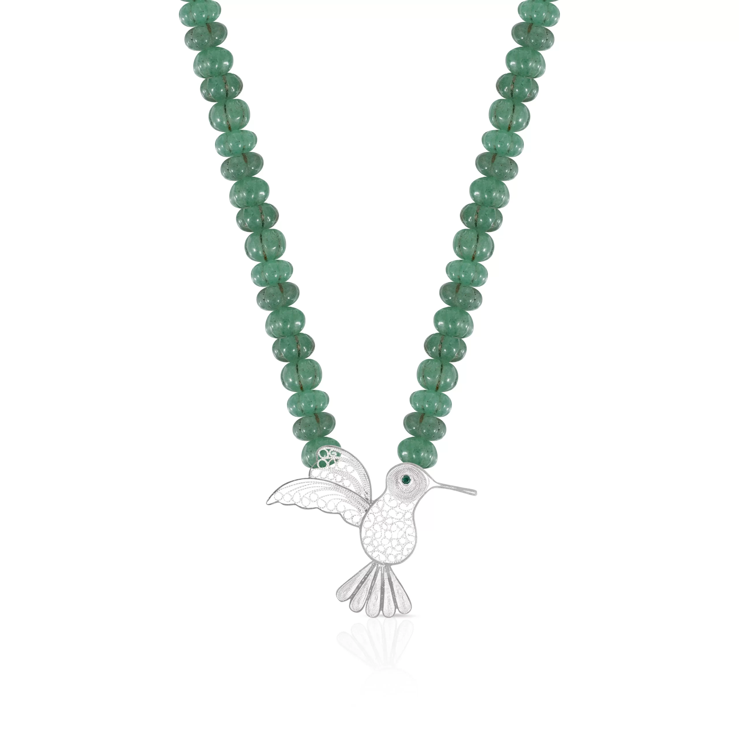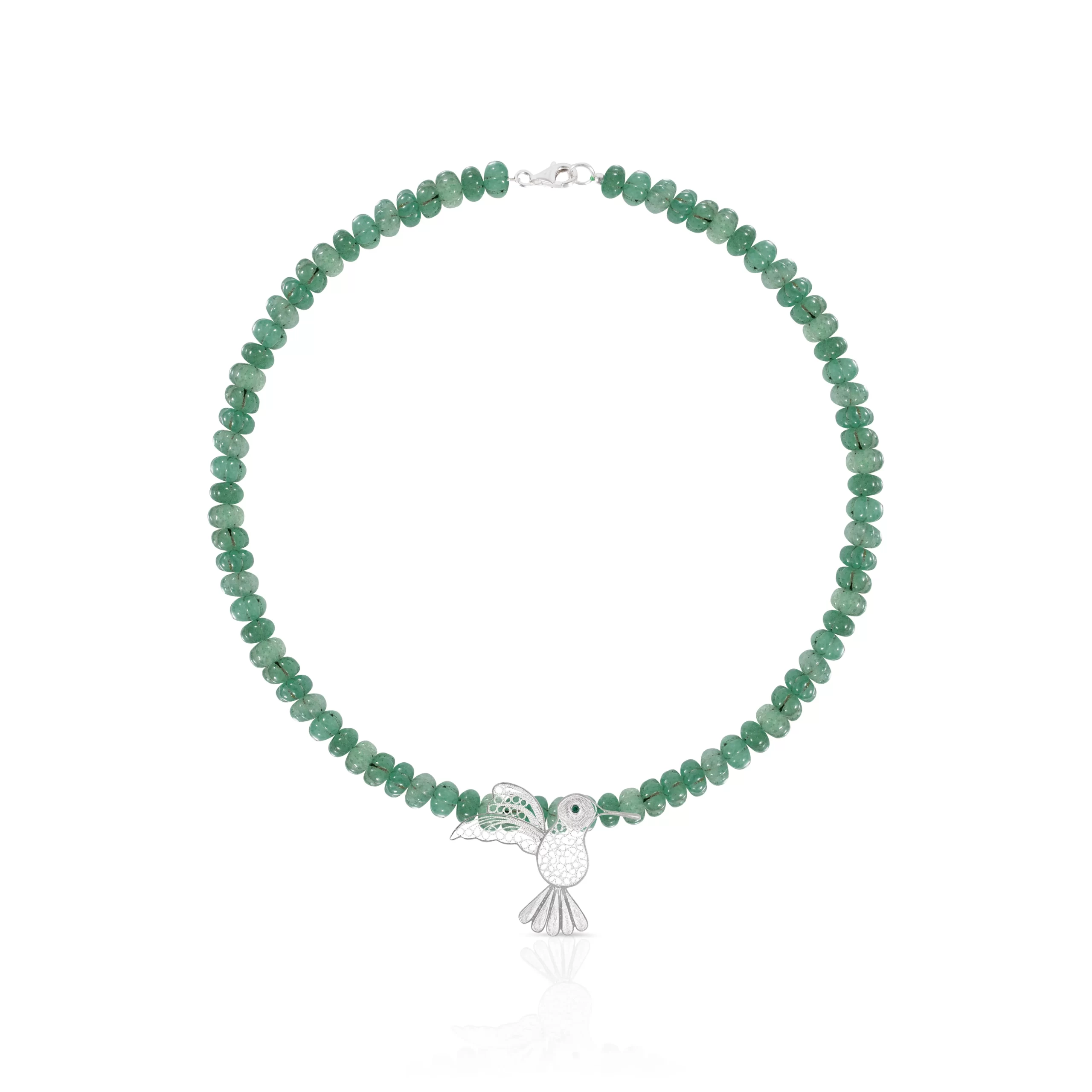 Collar Ónix verde elaborado con piedras naturales, en el centro tiene un dije de colibrí elaborado en filigrana mompoxina en plata ley 925.