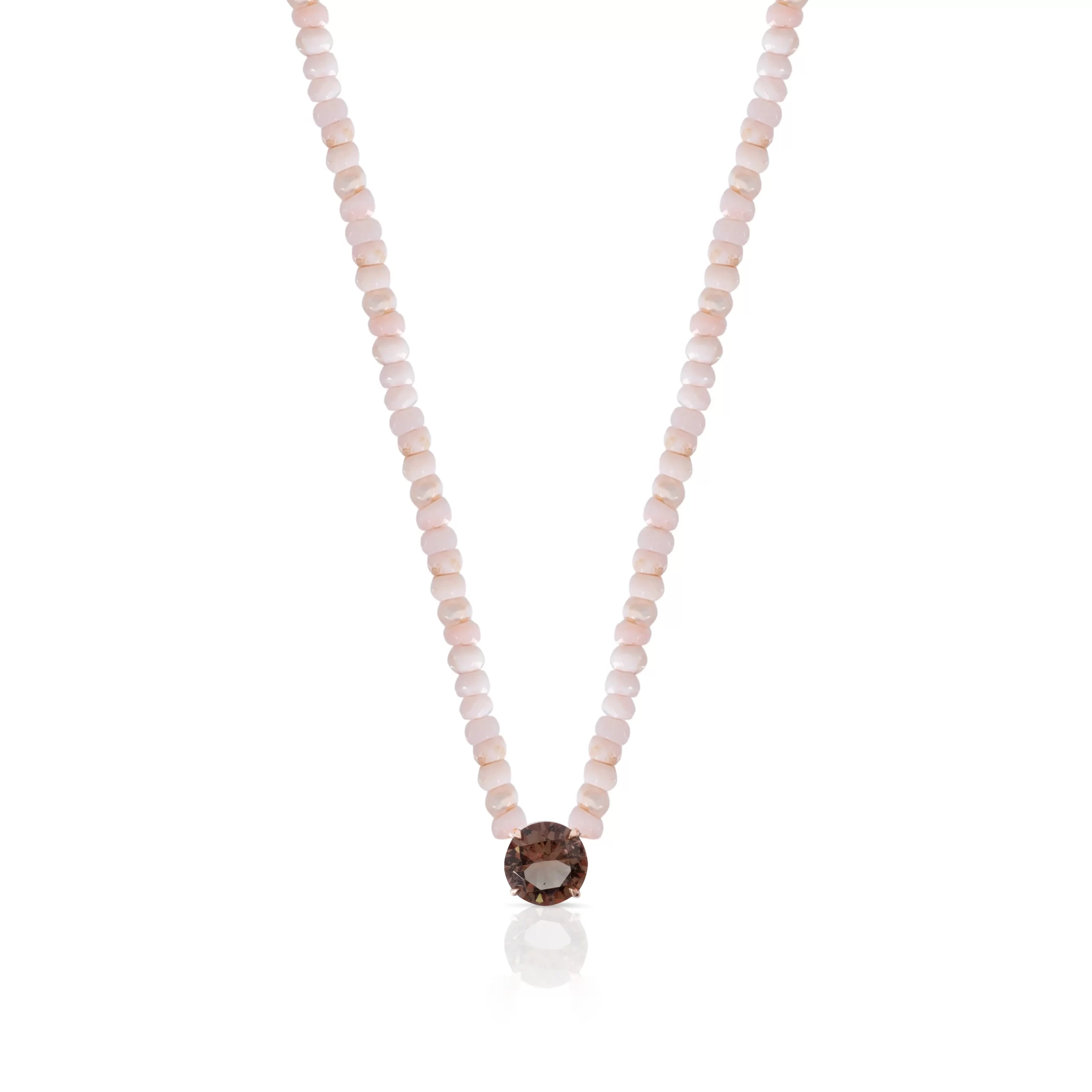 Collar de ópalo rosa elaborado con piedras naturales, en el centro tiene un dije elaborado en plata ley 925 y enchapado en oro de 24 quilates el cual engasta una zultanita.