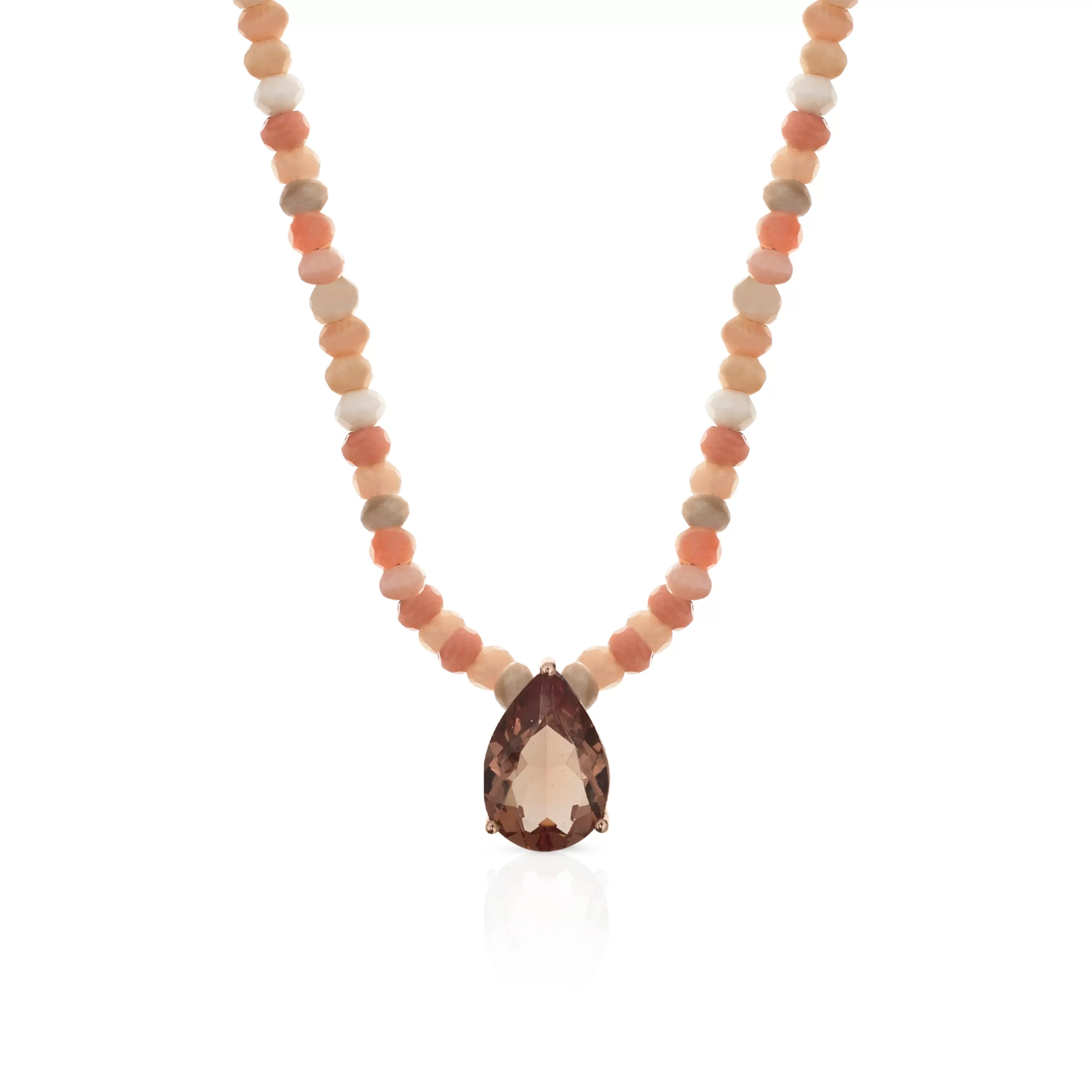 Collar de rodocrosita elaborado con piedras naturales, en el centro tiene un dije elaborado en plata ley 925 y enchapado en oro de 24 quilates el cual engasta una zultanita.