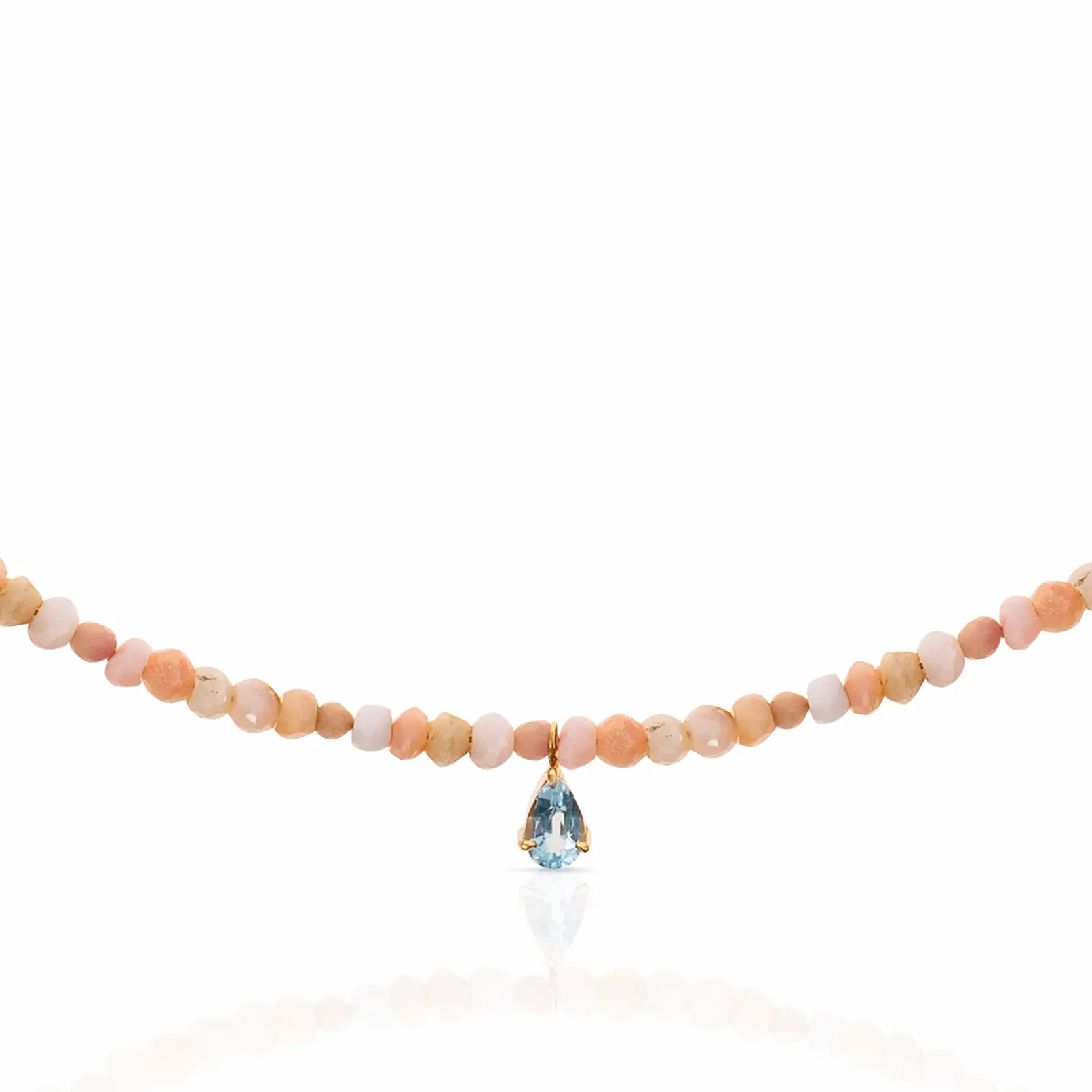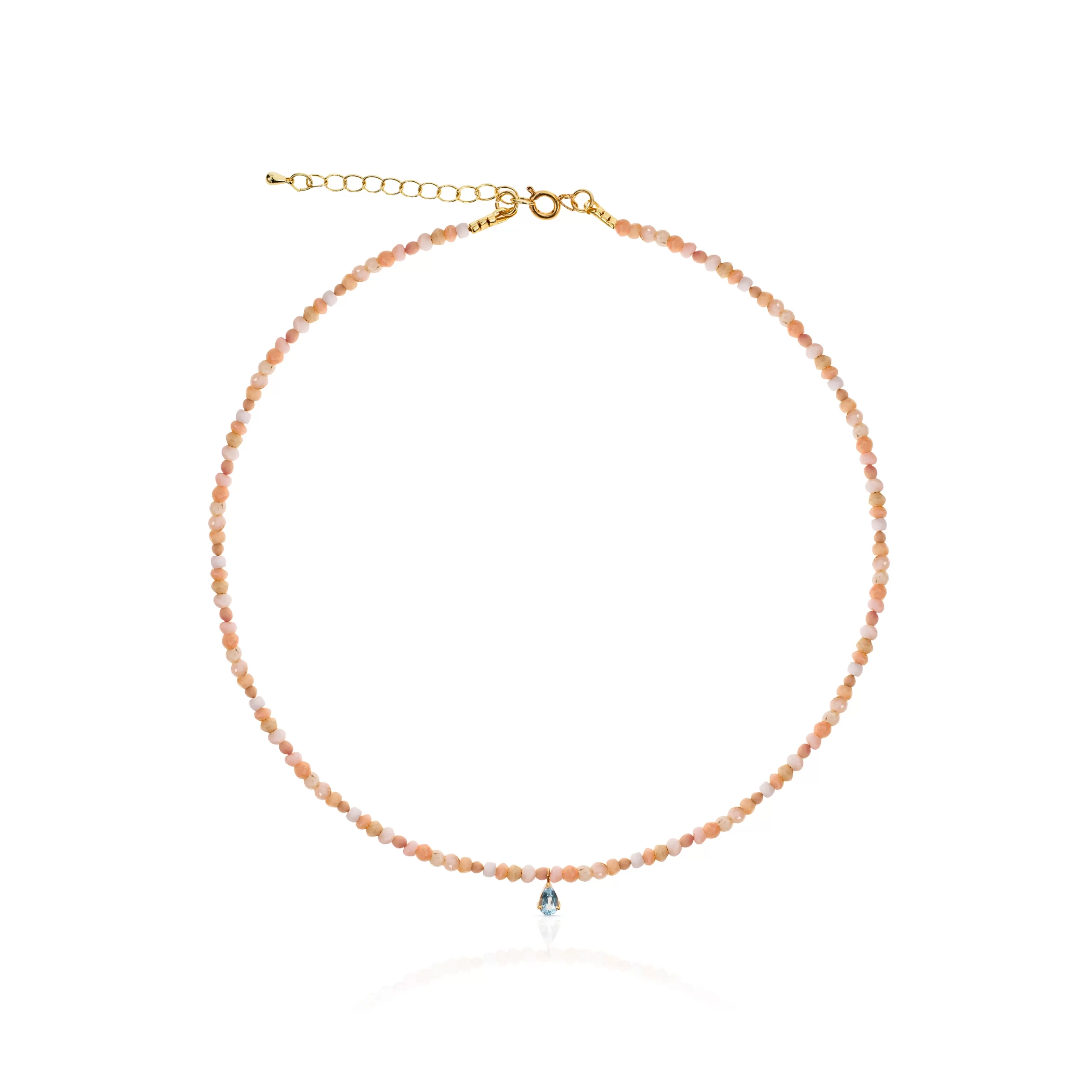 Collar de rodocrosita elaborado con piedras naturales, en el centro tiene un dije elaborado en plata ley 925 y enchapado en oro de 24 quilates el cual engasta un topacio azul.